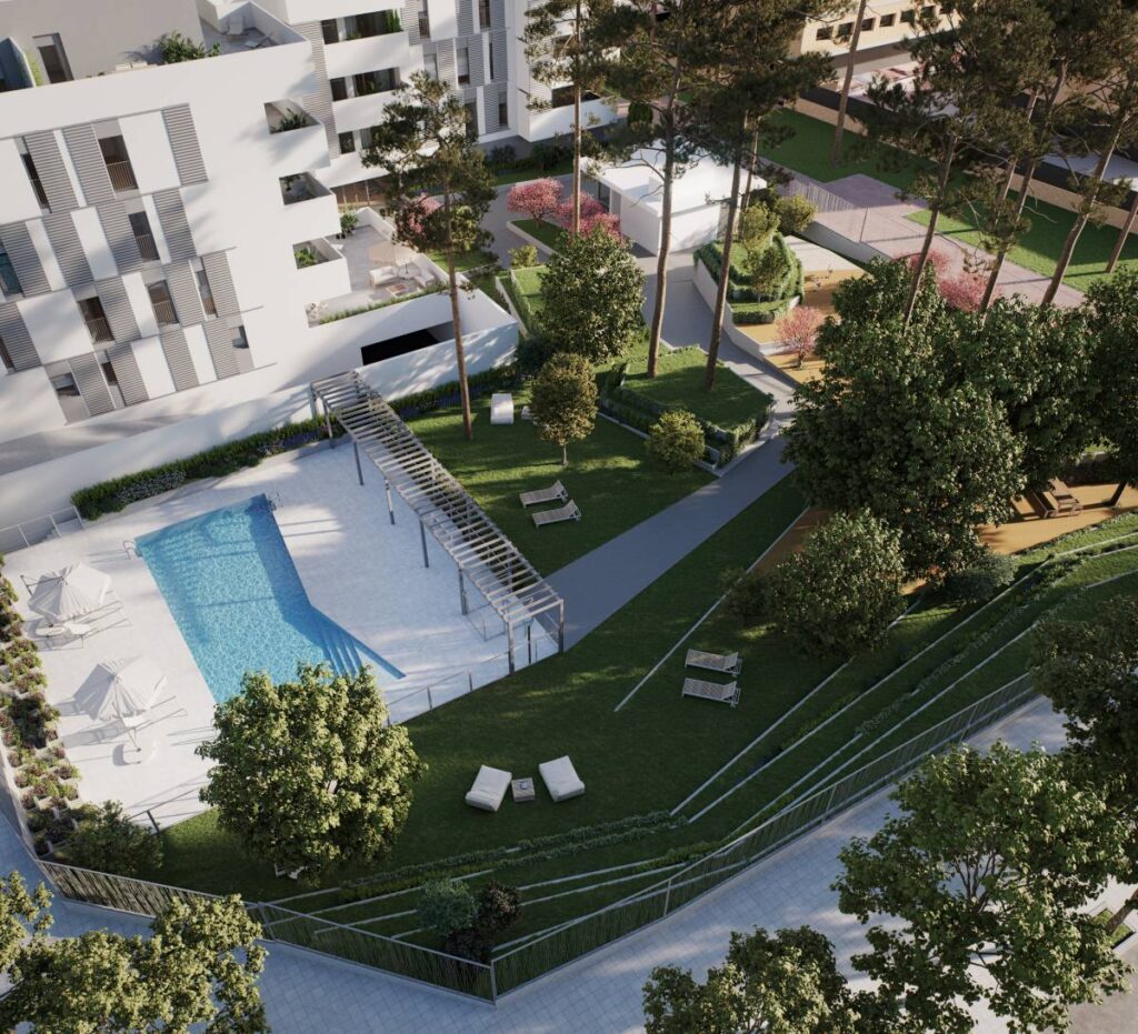Las cuatro fases han sido dotadas con zonas ajardinadas, piscina, área de juegos infantiles, una sala comunitaria multiusos y un gimnasio equipado.