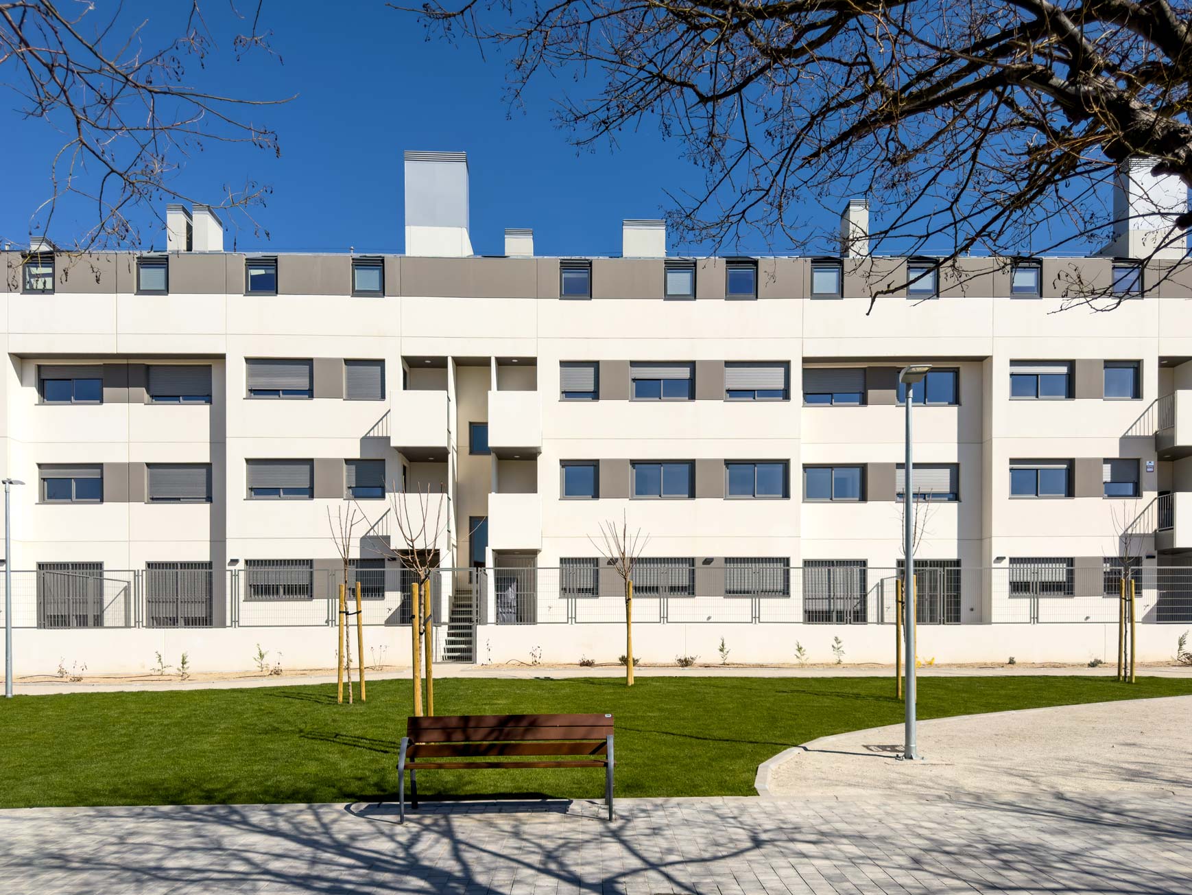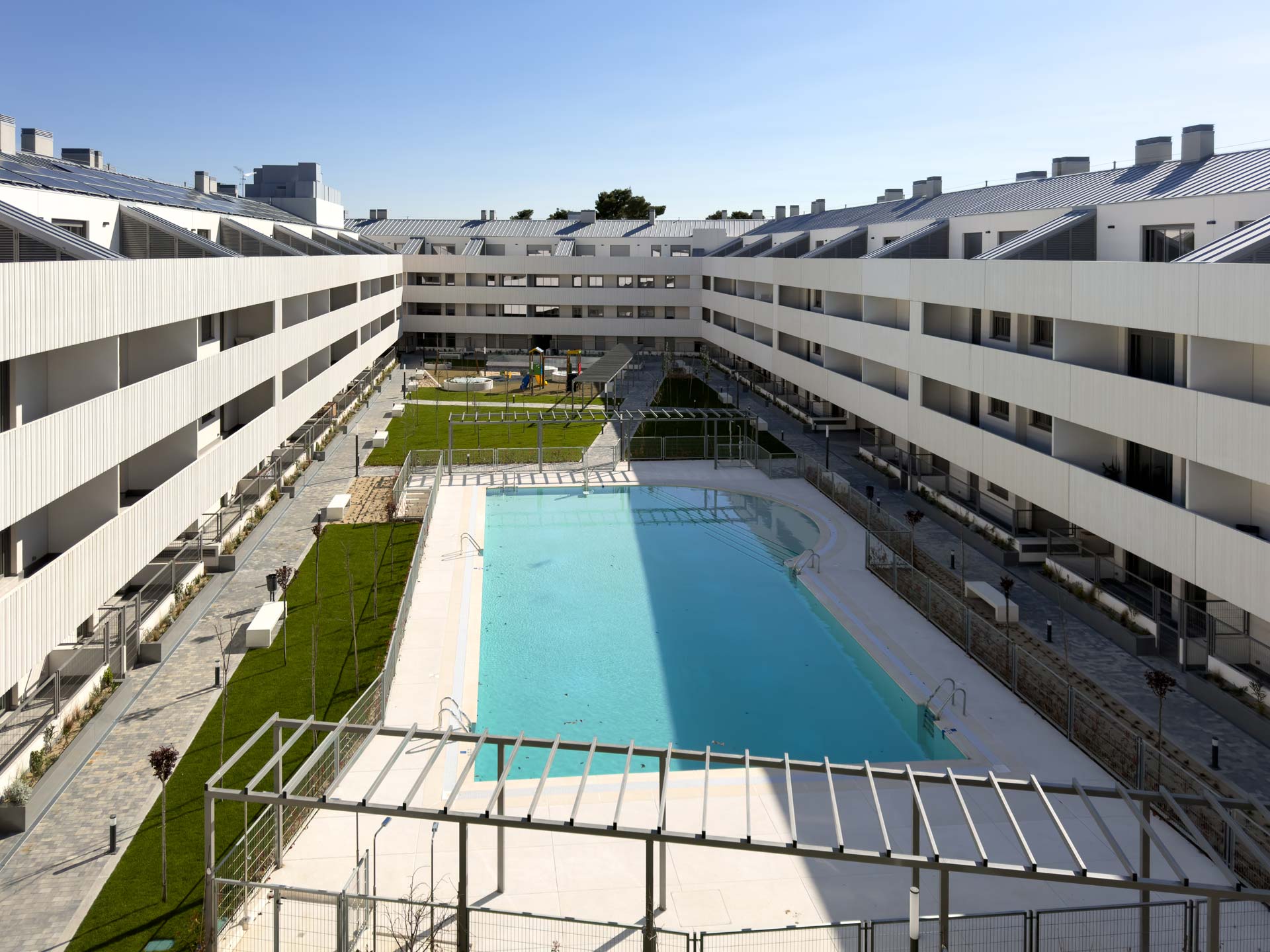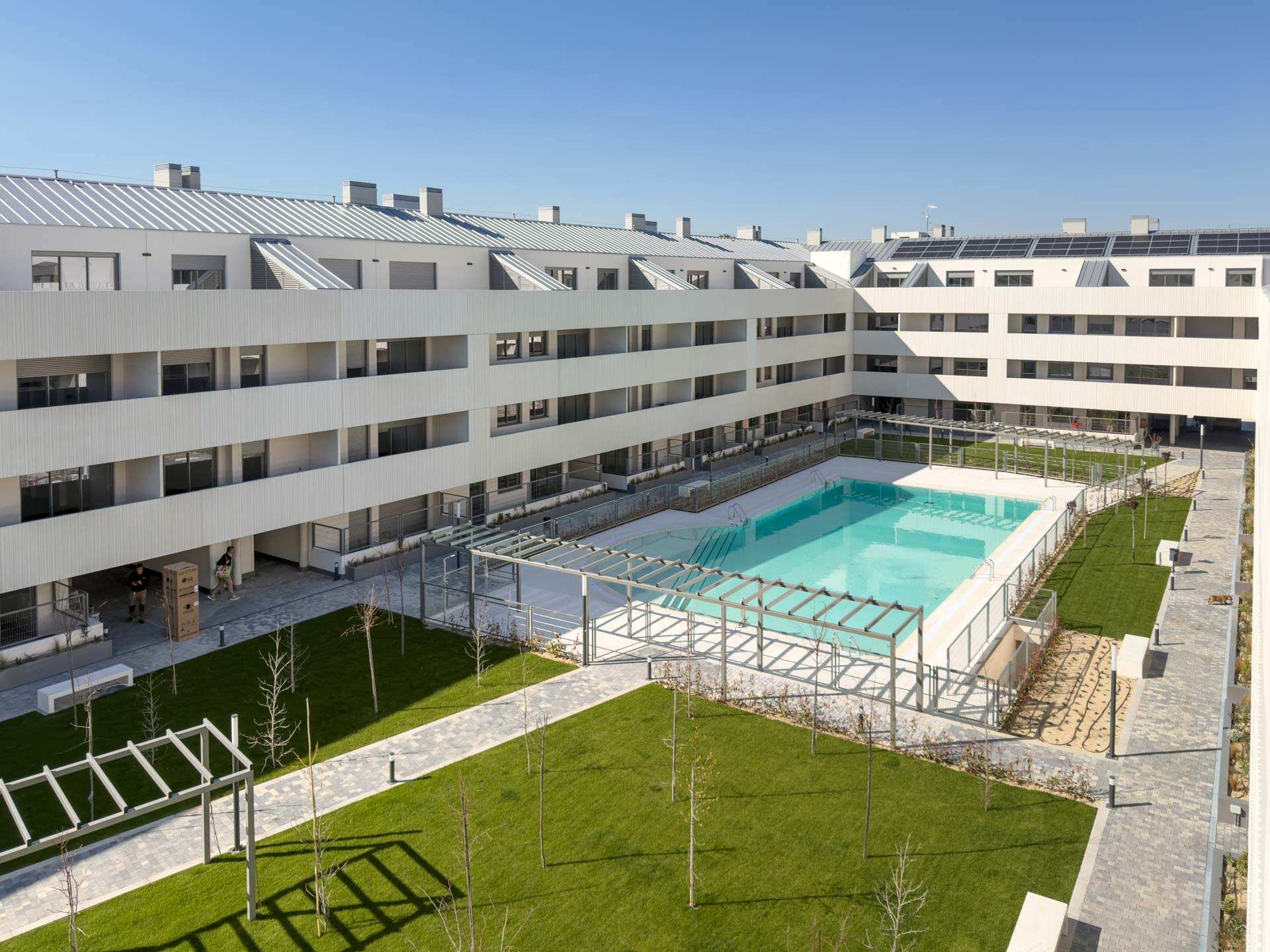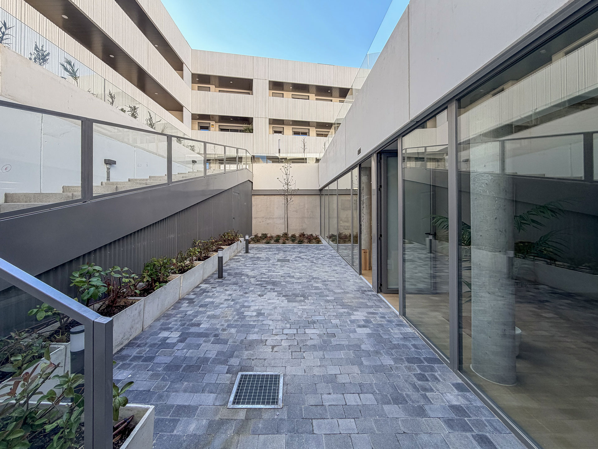 La arquitectura del conjunto responde a una línea moderna y funcional, con una organización en torno a un gran espacio interior que favorece tanto la privacidad de las viviendas como la relación entre vecinos.