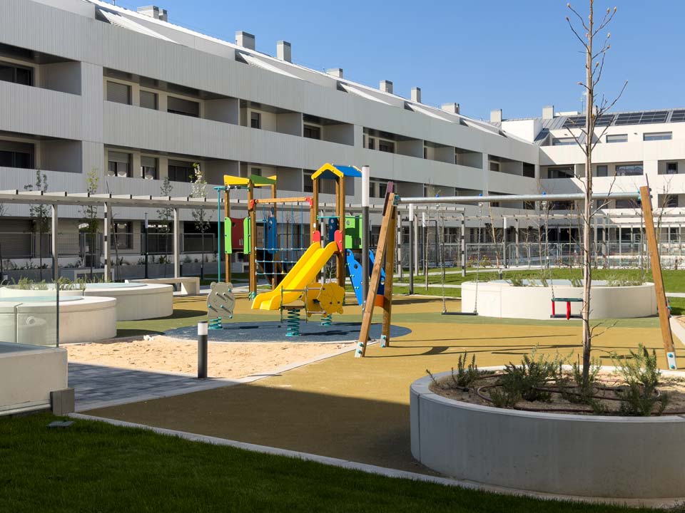 La promoción está compuesta por 137 viviendas de 2, 3 y 4 dormitorios, todas ellas con terraza o jardín privado, configurando un conjunto residencial donde el espacio exterior forma parte esencial de la vivienda.