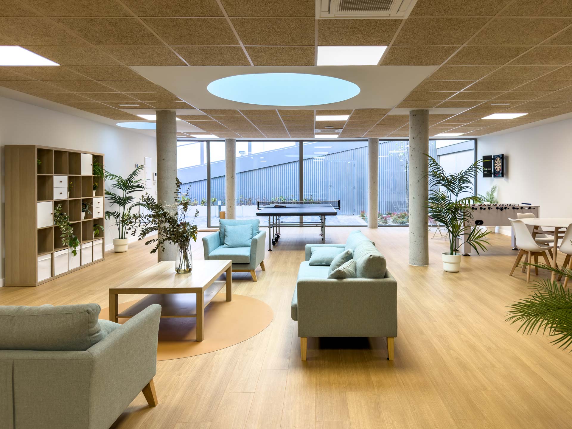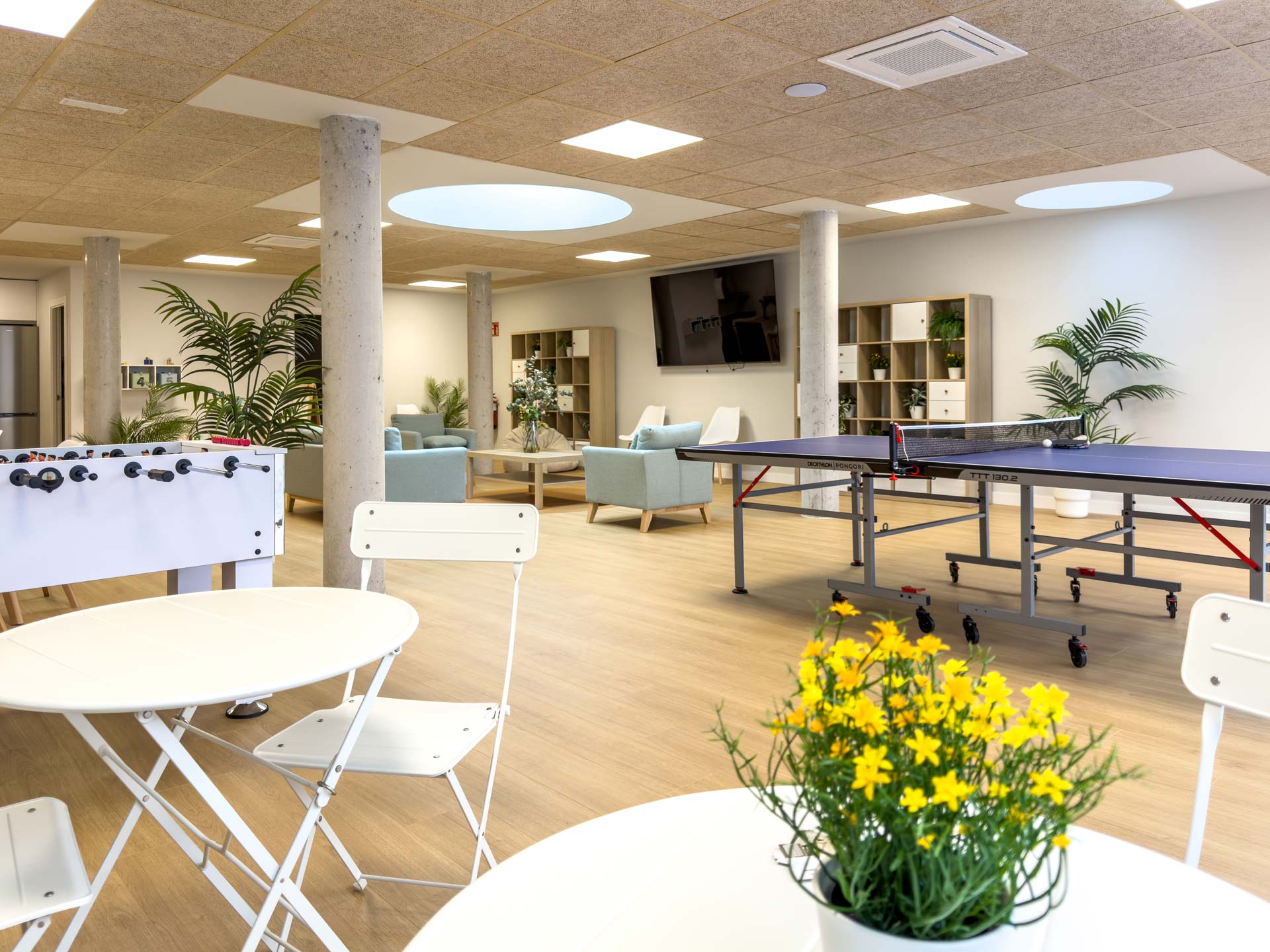 Uno de los elementos más representativos del proyecto son sus más de 3.000 m² de zonas comunes, que se convierten en el verdadero centro de la vida en la urbanización: amplias áreas ajardinadas, una gran piscina para los meses de calor, zona infantil, gimnasio totalmente equipado y una sala vecinal pensada para el encuentro, con espacios de ocio como ping pong y futbolín.